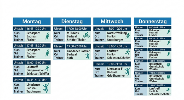 • Zeit: Montag 18:00 – 19:00 Uhr, 2 Gruppen, Treffpunkt: Bürgerweiher